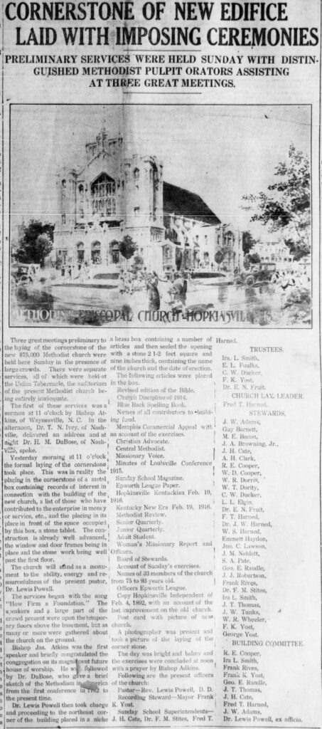 In 1914, he arrived at Hopkinsville First Methodist Church. The congregation was based in an 1849 building on the corner of East Ninth and Clay streets but wanted to build a new church in a new location. Powell’s reputation as a church builder preceded him. (Ironically, the church where he had overseen construction in Hot Springs had burned to the ground the year before.)