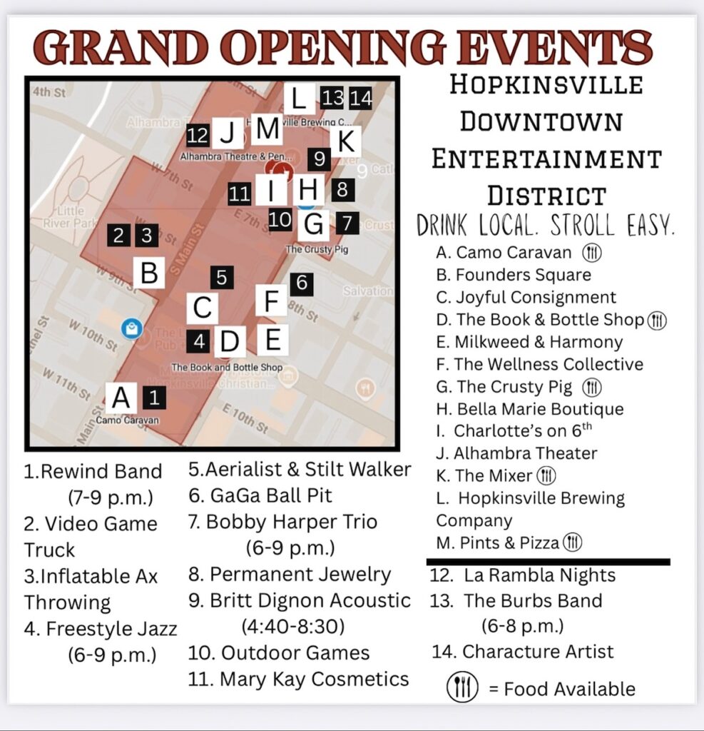The grand opening celebration of Hopkinsville’s Downtown Entertainment District will be Saturday, Aug. 23, with live music, food, games and shopping at several locations from 4 to 9 p.m.